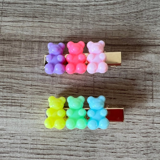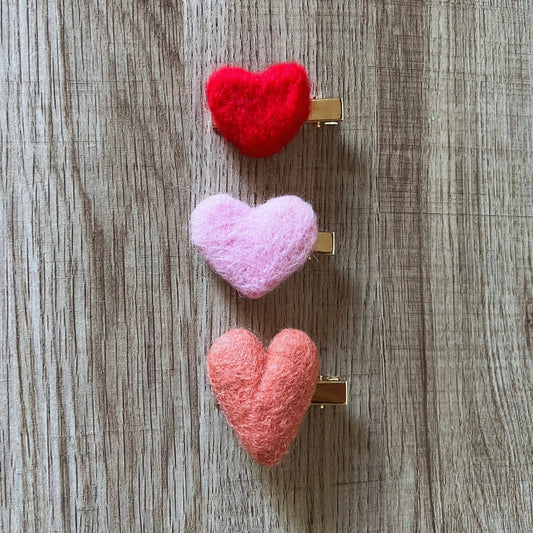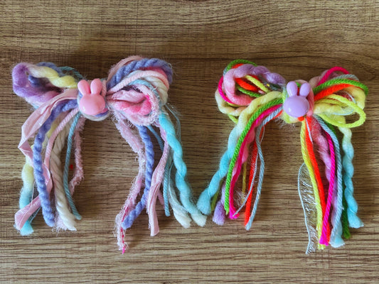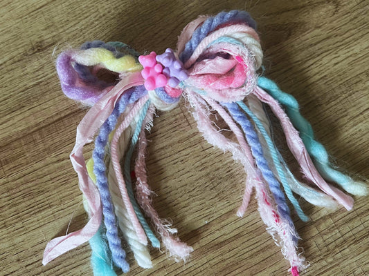 Whimsical girls hair bows & clips made from colorful yarns, ribbon, and beads.