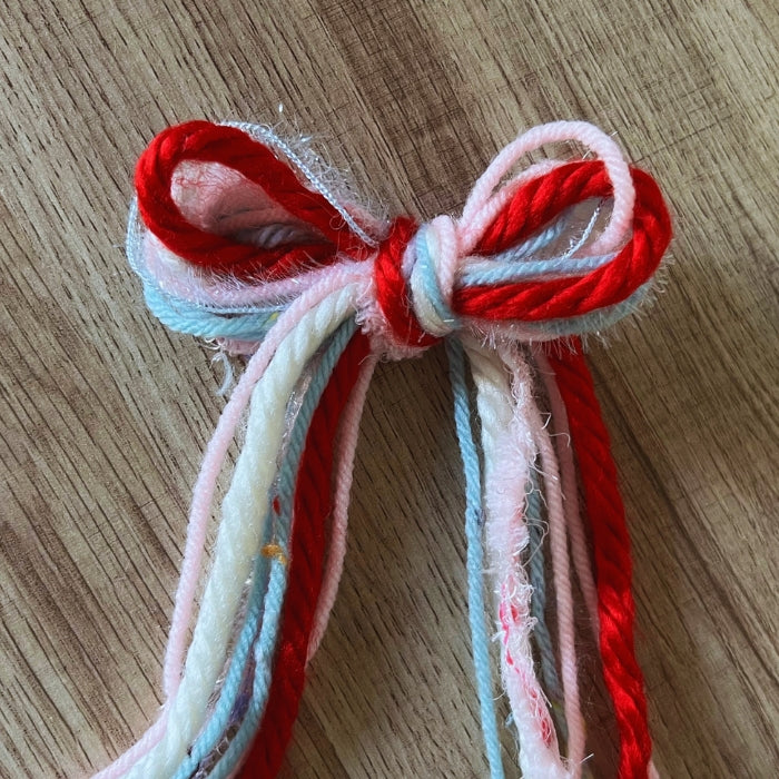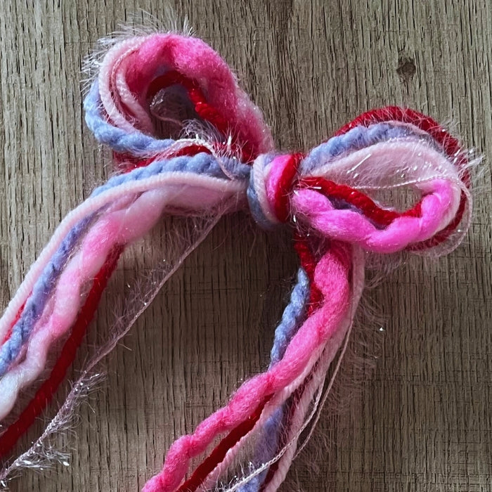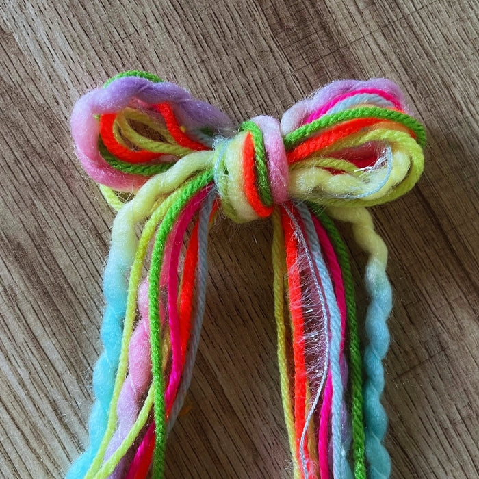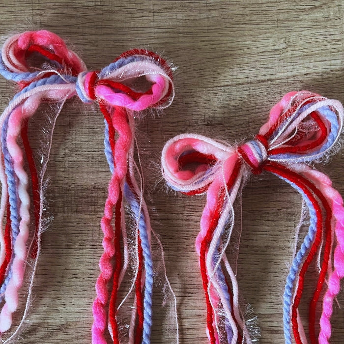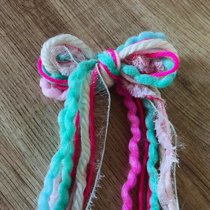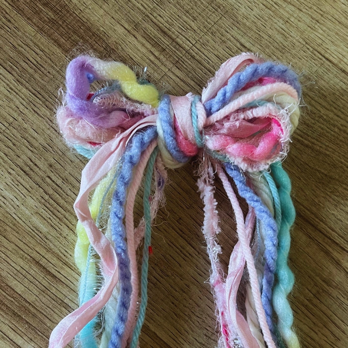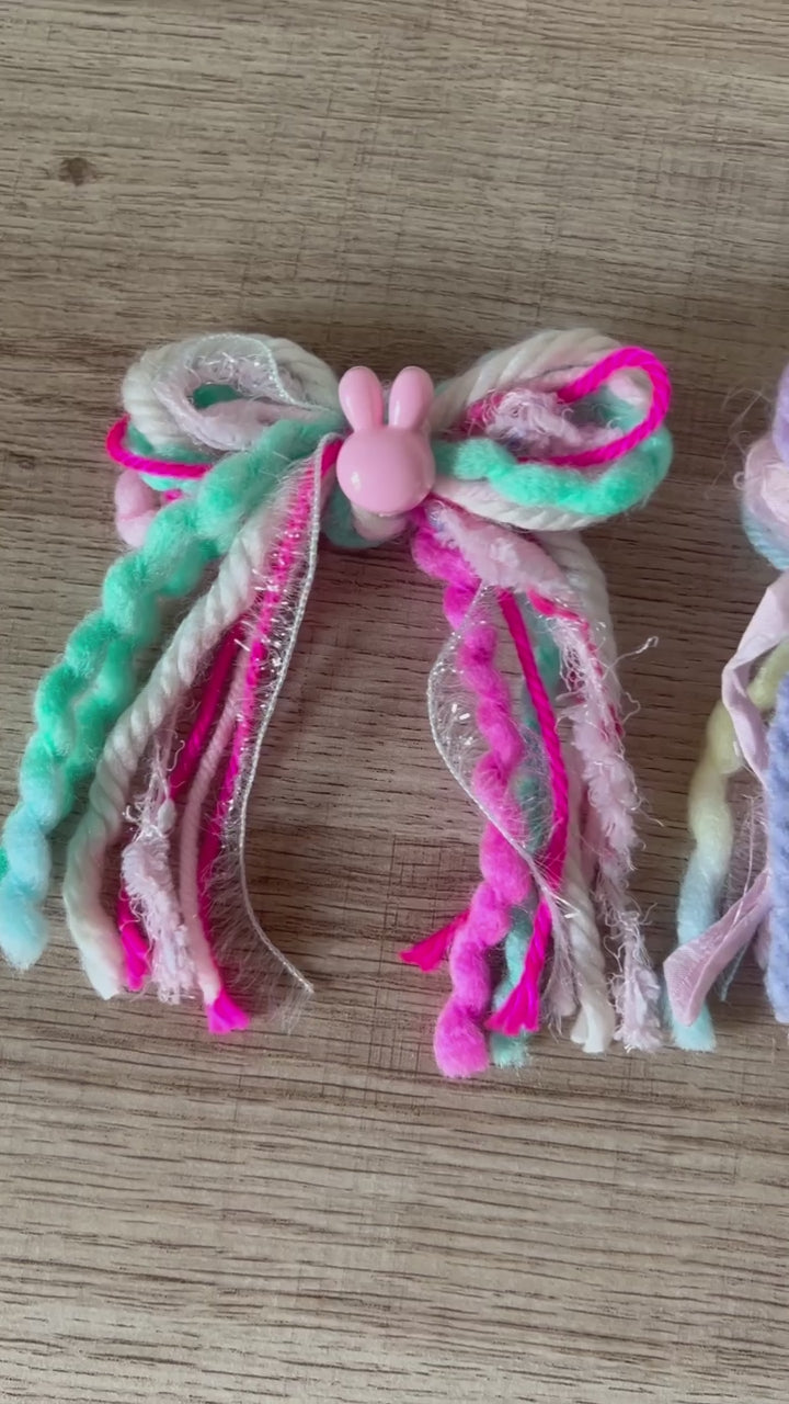 Whimsical yarn hair bows for littles. Each bow is uniquely handmade out of yarn and tinsel in your choice of colors. Bows measure around 3.5" wide x 4" long, and are attached to a small gold alligator hair clip measuring 1.8" wide. Due to the handmade nature, there will be variations in yarn color and size. The bow you receive will be close to, but not exactly as pictured. Message me if you have specific requests on yarn color, I'm always happy to try and accommodate!